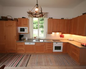 ванна/душ, подогреваемые полы; отдельный туалет; кухня (четырехконфорочная плита, духовка, посудомоечная машина, микроволновая печь) с кирпичной печью; спальня с двуспальной кроватью на втором этаже; крытая меблированная терраса, кладовка; красивая мебель в стиле Бидермайер, кабельное телевидение.