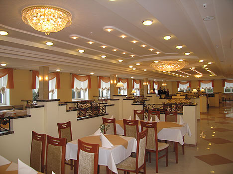 пятиразовое в одну смену. Два обеденных зала для питания (Янтарный и Малахитовый) с музыкальным оформлением.Разработано заказное 14-ти дневное меню по диетам 5, 10, 15, выделено отдельное меню по 8 и 9 диетам. Подготовлено редуцированное низкокалорийное семидневное меню для диетотерапии отдыхающих с выраженным ожирением.