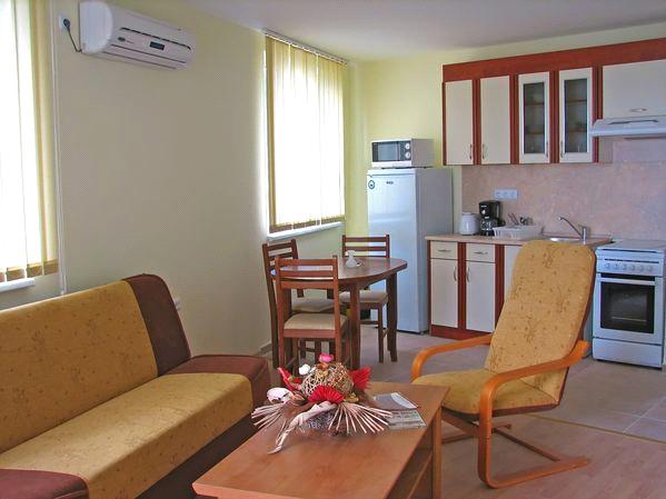 четырёхзвёздочная люкс квартира полностью меблированная,включающая спальные помещения-студия с 2 обычными кроватями,однокомнатные квартиры с 2 обычными и 2 дополнительными кроватями,двухкомнатные квартиры с 4 обычными и 2 дополнительными кроватями. Кухня полностью оборудована (холодильник,тостер,чайник,духовка,плита,вытяжка),в каждой комнате-кондиционер.Уборка включена.Спальное бельё и полотенца включены.В ванной душ. Есть кабельное телевиденте,балкон.