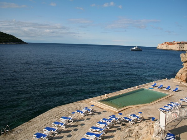 Собственный пляж-платформа и камень. С пляжа-платформы сразу начинается глубокое море, вход в которое осуществляется по металлическим лестницам. Примерно в 250 метрах от него находится отличный городской галечный пляж с двумя водными горками, а для того, что бы попасть на один из лучших мелкогалечных пляжей Дубровника вблизи неработающего отеля "Belvedere", надо пройти из отеля в противоположную от Старого города сторону примерно 15 минут.