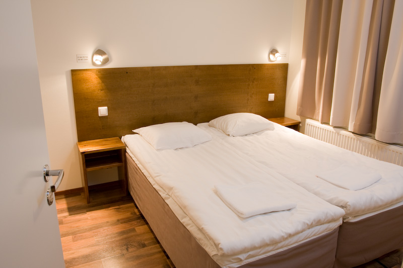 В апартаменте 43м2: 1 стандартная спальня (2 кровати по 80 см шириной каждая)спальная комната (двухярусная кровать, нижняя 120 см шириной, верхняя 80 см шириной), кухня, отднльный туалет, сауна, душ и балкон. Всего в апартаменте 4+1/2 спальных мест (диван в гостиной может быть использован как дополнительное спальное место для 1 взрослого или 2 детей).