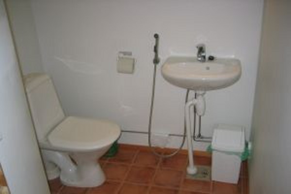 на 1-м этаже: гостиная-кухня, спальня (две односпальные кровати), сауна, душ, WC; на 2-м этаже: 2 спальни (в одной три односпальные кровати, в другой 2 односпальные кровати), WC.