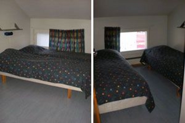 на 1-м этаже: гостиная-кухня, спальня (кровать 120 см), балкон сауна, WC, душ; на 2-м этаже: 3 спальни (по 2 односпальные кровати), в двух из них есть балконы, WC. Лестница на 2-й этаж с детскими воротами наверху.