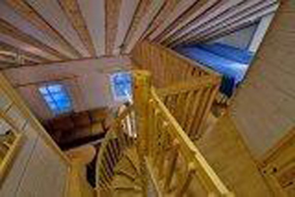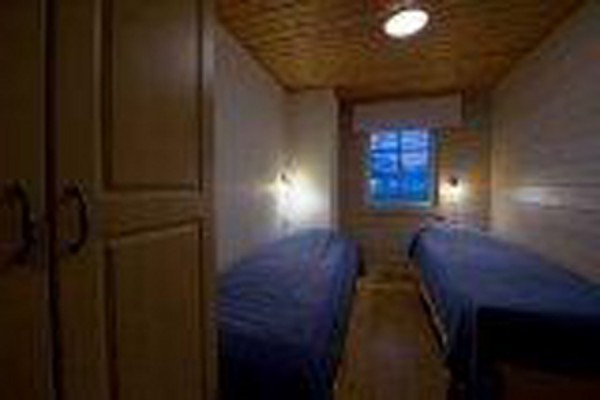 на 1-м этаже: спальня (2 односпальные кровати), гостиная-кухня, камин, сауна, WC; на 2-м этаже: 2 спальни — в одной спальне нет окна, в другой есть небольшой балкончик (по 2 односпальные кровати), 2 односпальные кровати в алькове, WC.
