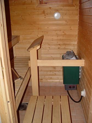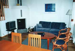 Первый этаж коттеджа Tahko Golf: отдельная спальня, гостиная (ТВ, видео, камин, радио), электрическая сауна, душ, туалет, сушильный шкаф, кухня (электроплита, духовка, посуда, микроволновка, посудомоечная машина, кофеварка).