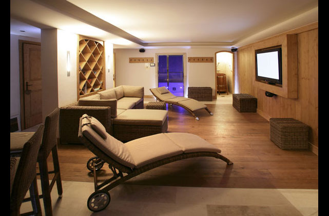 - Просторная зона отдыха с камином, большим телевизором с плоским экраном рядом, с кожаными креслами и библиотекой DVD-дисков