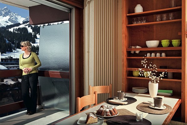 - Studio Cabine 4 pax Valley Facing (27 m2): комната с двуспальной кроватью и двухъярусной кроватью в кабине. Балкон. Вид на долину.