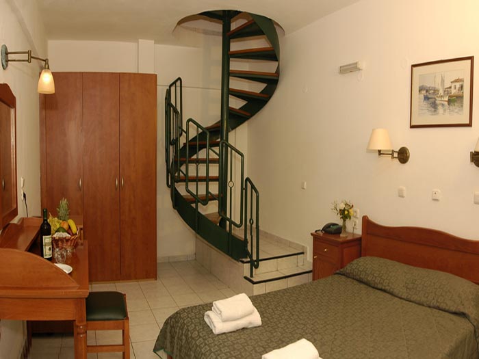 в 35 км восточнее аэропорта г. Ираклион, в 6 км от Херсониссоса, в курортном местечке Сталис, в 50 м от песчаного пляжа через дорогу.