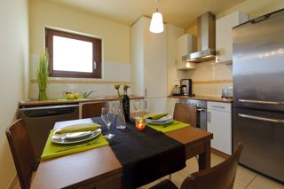 - полностью оборудованная кухня с газовой плитой, кофеваркой, чайником, тостером, посудой, столовыми приборами и кухонными принадлежностями;
