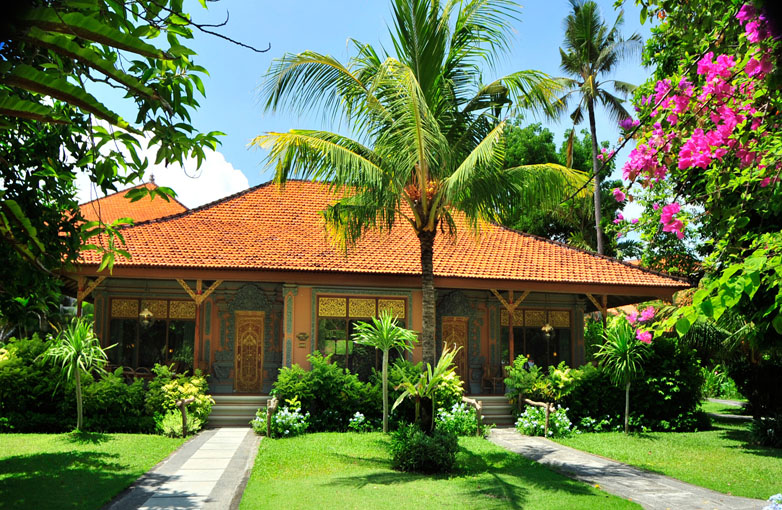 # оформление территории отеля Традиционная балийская архитектура в обрамлении мелкого белого песка и кристалльно чистого океана.