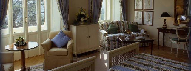 153 номера. Комнаты с высокими потолками, создают ощущение домашнего уюта и предлагают насладиться прекрасным видом на старый город, парк или горы. Великолепные ванные комнаты выложены мрамором. Кровати убраны знаменитым итальянским льняным постельным бельем. Мрамор, штукатурка и работа по дереву, старинная мебель и картины, драгоценные стеклянные люстры Murano, парчовые занавески и старинные ковры: каждый объект вносит свой вклад в изящную атмосферу дворца, создание очаровательного прошлого, которое многие ищут и ценят в гостинице сегодня. Все помещения чрезвычайно просторны, изящно украшены художественными изделиями, номера с великолепной мраморной ванной с феном.