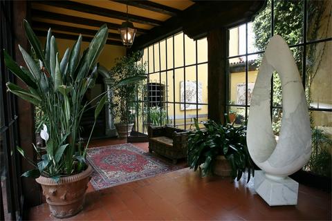Флорентийский каменный камин 18го века, пол, выложенный керамической плиткой, и деревянные перегородки - создают теплую, уютную атмосферу в комнате. Меблировка умело сочетает в себе старинные и современные предметы мебели: диваны и кресла от Frau mix с античным столом, зеркалом в имперском стиле, а так же оригинальными картинами 18го века. Свет в стиле Версаче освещает множество скульптур и предметов современного искусства. Ванная комната выполнена из кафеля Vietri, с зеркальной стеной и небольшой мансардой с личным спортивным залом.