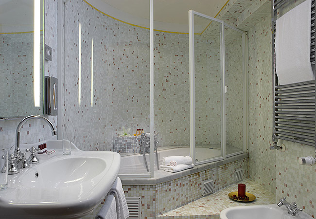 Туалеты являются оазисом комфорта и роскоши среди небольших узоров из мозаики: фарфор с мягкими линиями, в котором чувствуются отголоски классической красоты, ванны с гидромассажем и шотландским душем.