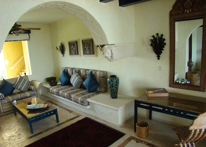 Master Suite Ocean Front with terrace (Upper Level) 170 кв. м, всего 4 номера, максимальная вместимость 4 взрослых. Две спальни, каждая с собственной ванной комнатой с ванной для двоих, душем и умывальниками ручной работы. Из обеих спален и гостиной выход на большую собственную террасу с двойными шезлонгами.