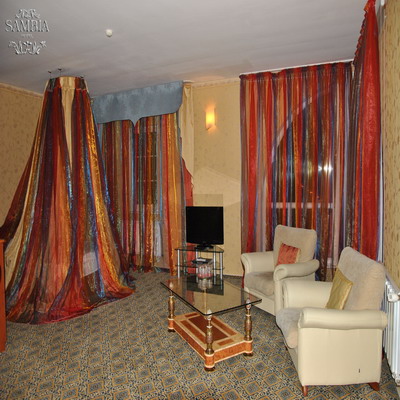 2-местные 2-комнатные люксы (32 кв. м, 2-спальная кровать, мягкая мебель, телевизор, DVD, холодильник, телефон, сейф, фен, ванна, душ, биде, туалет, банные принадлежности, французский балкон).