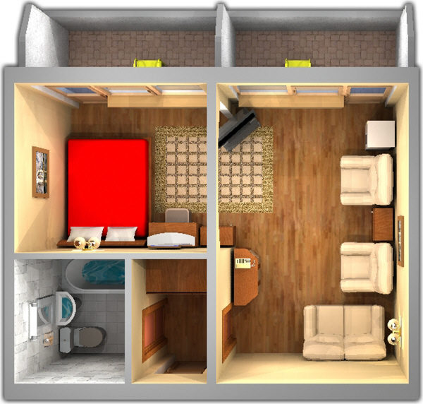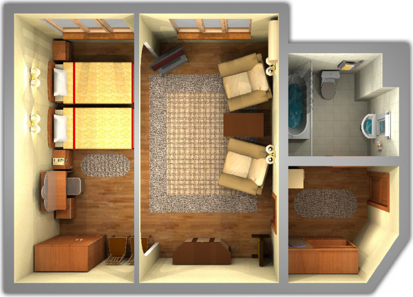 1 и 2-местные 2-комнатные люксы (балкон, душ, туалет, телевизор, холодильник, радиоприемник, телефон с выходом на внутреннюю, междугородную и международную связь, столовые и чайные сервизы).