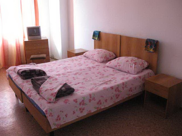 * 3-х местный 2-х комнатный полу-люкс (~ 11+14 кв.м.) с удобствами – санузел (душ, туалет, раковина), телевизор, холодильник, вентилятор (северная сторона; в летний зной в номерах прохладно), диван, электрический чайник. Доп. место – 2.
