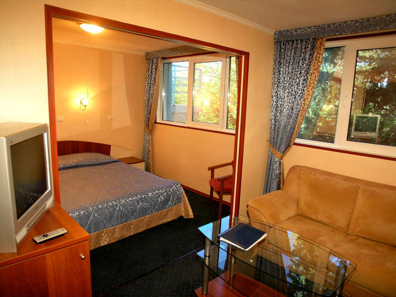 2-х местный 2-х комнатный люкс «евро» (~30 кв. м) 1-3 этаж или 4 этаж – с удобствами (душевая кабина, туалет, раковина), гостиная, спальня, телевизор, холодильник, сплит — система, фен. Доп. место – 2. Холодная и горячая вода постоянно. Возможно 1-но местное размещение в 2-х местном номере с коэффициентом 1,8.