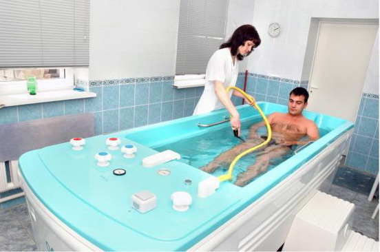 В гидротерапевтическом комплексе проводятся бальнеологические процедур. Лечебный эффект достигается путем применения йодобромных ванн, хвойных, нафталановых, ароматических фитованны, бишофитовых, жемчужных ароматических, жемчужных пенистых, солевых, биопенных, бальзамных, морских ванн, ванн с солью «Древнего моря». Используют также струевую контрастную 4-х камерную ванну.