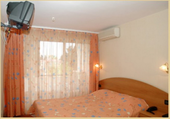 Однокомнатный двухместный номер "Бизнес Комфорт". Номер с балконом. На балконе: два пластиковых стула и стол. В номере имеется большая двуспальная кровать (или две односпальные), две прикроватные тумбочки со светильникам, гардероб, стол с встроенным фригобаром, зеркало, вешалка, телевизор, кондиционер. Ванная комната: импортная сантехника, душевая кабина, аксессуары, махровые полотенца и косметические принадлежности. Пляжные принадлежности: зонтик, пляжное полотенце.