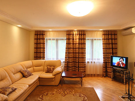 (2) 2-местные 2-комнатные люксы (спальня с двуспальной кроватью, гостиная с мягкой мебелью, телевизор, холодильник, чайник балкон, паркет, доп. место - раскладной диван).