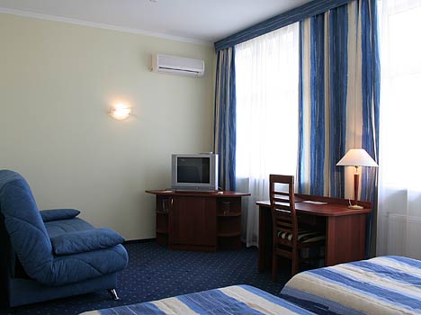 • студия. В номере: душевая кабина, фен, ТВ, мини-бар, кондиционер, телефон, выход в интернет, двуспальная или две полуторные кровати;