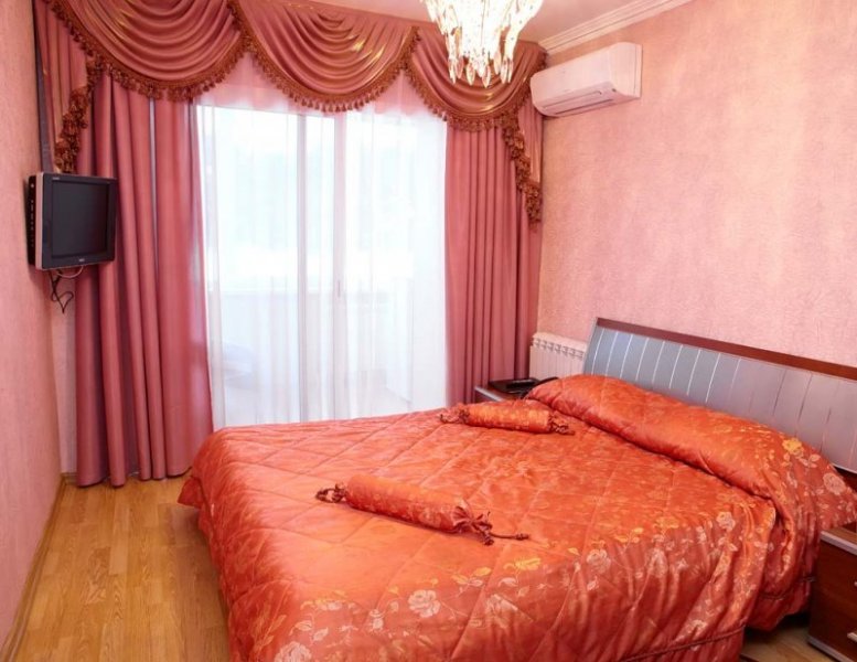 Апартаменты (двухкомнатные) — телевизор, телефон, кондиционер, встроенный холодильник, 2-х спальная кровать и прикроватные тумбы, комод с зеркалом, бра, полка нависная, стенка-горка, журнальный стол, торшер, мягкая мебель, шкаф-купе, шифоньер, кожаные стулья и бра на балконе, душевая кабина, биде, унитаз, «мойдодыр», фен, посуда;