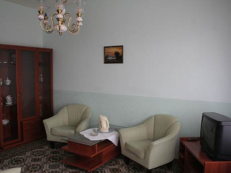 2-х местный 2-х комнатный номер "люкс" – санузел с ванной, биде, 2-х спальная кровать, мягкая мебель, телевизор, холодильник, стенка с посудой, телефон, балкон, евроремонт.