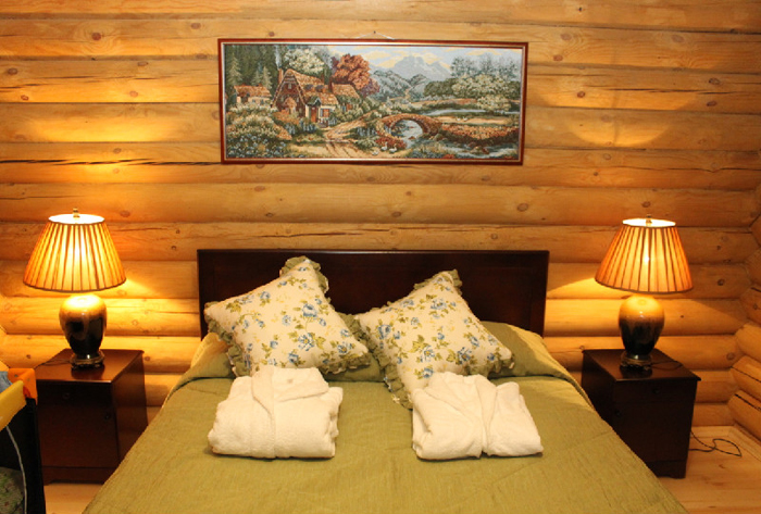 2-й этаж – 2 спальни, ванна с гидромассажем, туалет. Также в коттедже - электроплитка, мини-бар, электрочайник, СВЧ-печь, посуда, сейф, вязанка дров для камина, журнальный столик, ЖК-телевизор, DVD-проигрыватель, 2 фена)