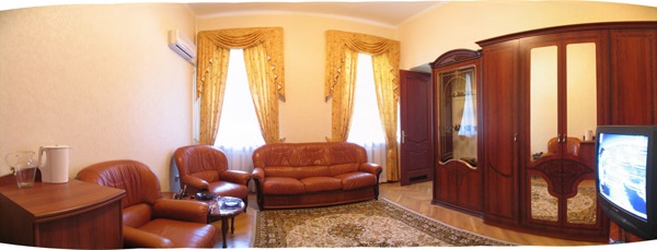 1-, 2-местные 2-комнатные люксы (2-комнаты – гостиная и спальня; 1,5-спальные кровати, ванна, душевая кабина, 2 туалета, телевизор, холодильник, телефон, музыкальный центр, электрочайник, мягкая мебель, набор посуды, кондиционер, балкон),