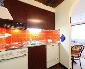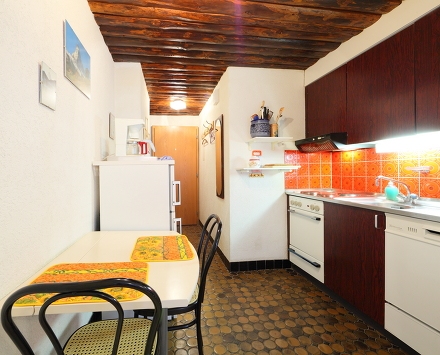 гостиная/столовая комната с 1 двуспальной раскладной кроватью (140 см), спутниковым-ТВ. Кухонный угол в коридоре (духовка, посудомоечная машина). Душ/туалет. Балкон (8 м2). Боковой вид на горы.