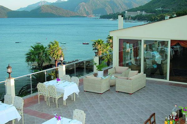 расположен в 100 км от аэропорта г. Даламан, в 3 км от центра г. Мармарис, на самом берегу моря.