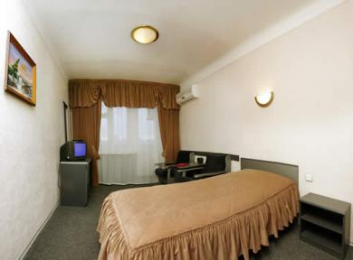 - 1-местный стандартный номер - Одноместный, однокомнатный номер, с полным санузлом (сантехника, душевая кабина). Номер оснащен современной мебелью: кровать, письменный стол, стул, большое зеркало, уголок отдыха (журнальный столик, два мягких кресла), холодильник, минибар, ТВ (кабельное, 18 каналов, включая российские), картины, телефон.
