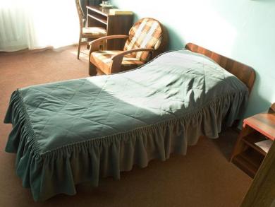 - 1-местный номер эконом класса - Одноместный, однокомнатный номер с полным санузлом (умывальник, унитаз, душ). В номере: кровать, мягкое кресло, письменный стол, журнальный столик, телефон, ТВ (кабельное, 18 каналов, включая российские).