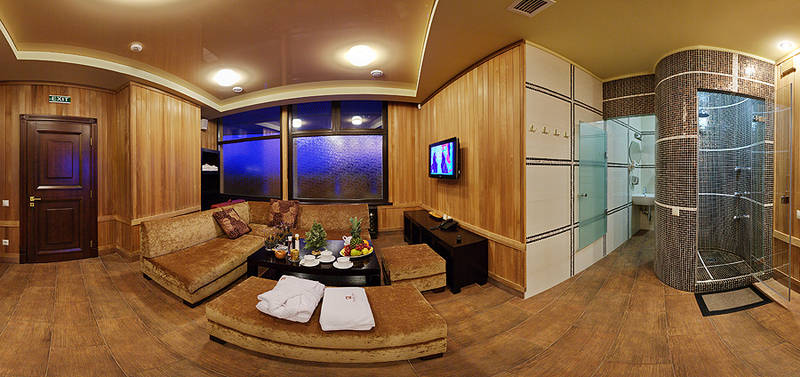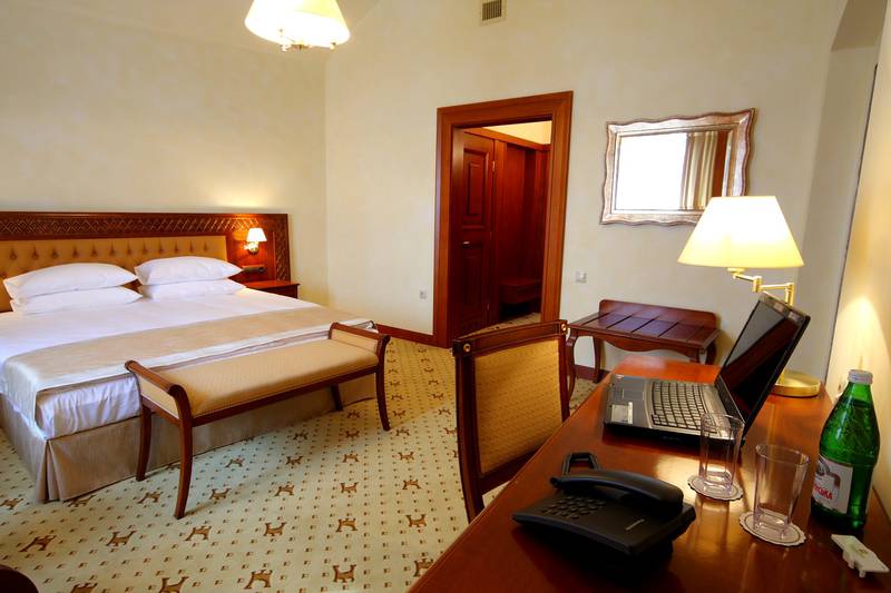 - Люкс; Просторный номер, состоящий из 2 комнат - гостиной и спальни. Бра подобранные с изысканным вкусом, итальянские мебель и все сопутствующие аксессуары прекрасно гармонируют с классическим стилем интерьера номера. Гостиная обустроена мягкой частью, (раскладывающийся при необходимости), журнальным и письменным столом, телевизором, телефоном и мини-баром. В спальне находится двуспальная кровать, шкаф для одежды и телевизор. Ванная отделана мрамором с отдельным душем и ванной.
