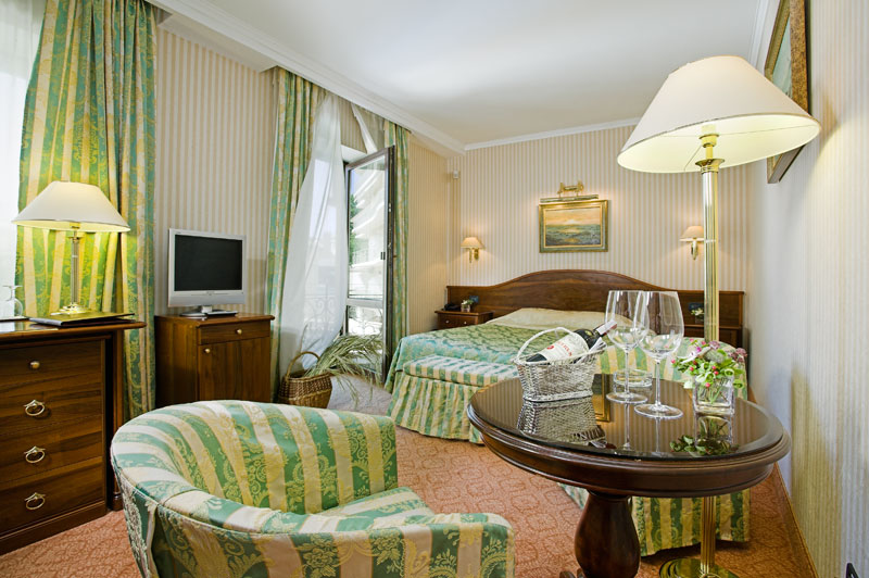 - 1-2-местный 1-комнатный «стандарт джуниор»: совмещенный санузел с ванной (фен, косметический набор, осушитель для рук, набор полотенец и др.), номера с видом на летнюю террасу или с балконом. В номере: набор мебели, кровать King Size. Доп. место не ставится.
